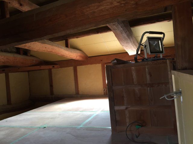 リビングはお気に入りのカフェのように、時の経過とともに味の出る素材を使いたい。シンプルに仕上げて、自分で棚を造ったりして、自分達の「家作り」を楽しみたいという希望でした。古くて味わい深いものが好きだということにも共感し、新築同様を目指すものでなく、時を経た物の価値を再認識し、それを生かして住まい手にとっての価値を上げることを目指しました。天井裏に隠れていた、味のある「曲がり梁」は汚れを落としてペイントして使っています。リビングの壁は杉板を縦貼りして、施主のHさんが白い水性塗料で仕上げました。